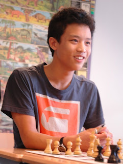 After taking a half-point bye on Friday night, she lost two, drew one and won one, to finish on a creditable 2 points. Her win featured a strange blunder by her 144-graded opponent. In this position he played 19... h6, clearly fearing that Anita was about to play h6 herself. Of course, Anita played 20. Qxf6, forcing immediate resignation.