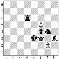From this position (left), the moves were: 1... Ne5+, 2. g4 fxg3 3. Kxe5, which gives us the position in the problem (right): |
