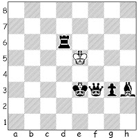 This was the easiest of the four puzzles, and everyone got it right. 1. Qd6, maintaining the symmetry. If the Black king takes a pawn, then Qa3 or Qg3. If ...d4, then Qxd4. |